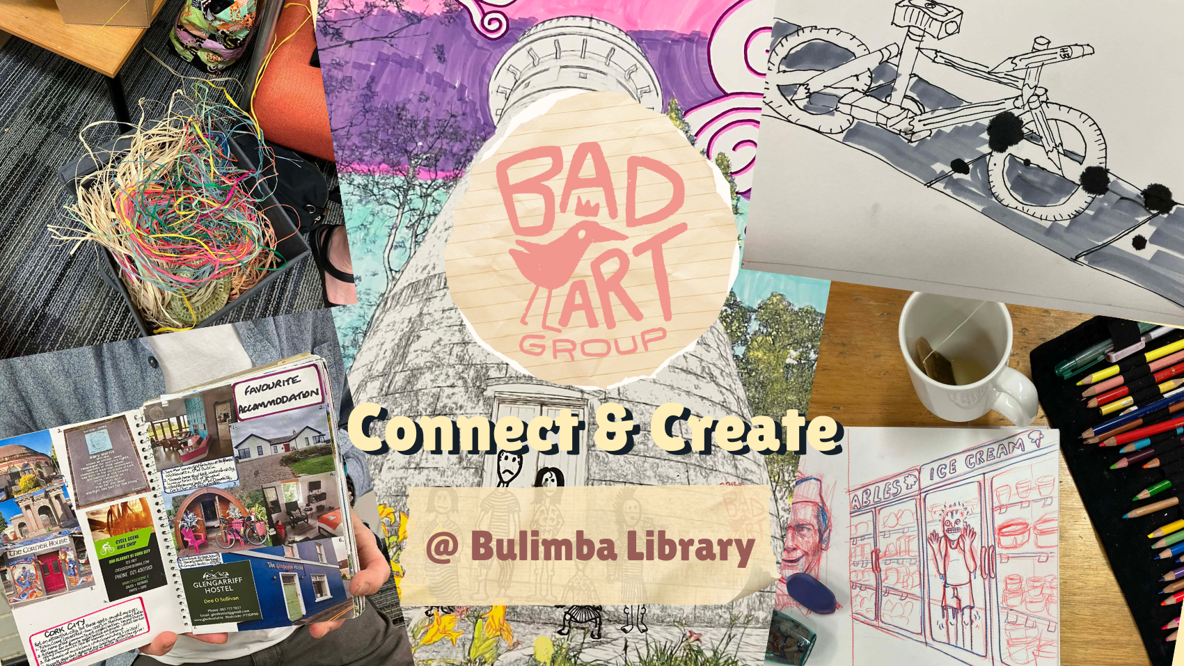 Bulimba Library Meeting Room 2 – Look for the Bad Art Group sign.